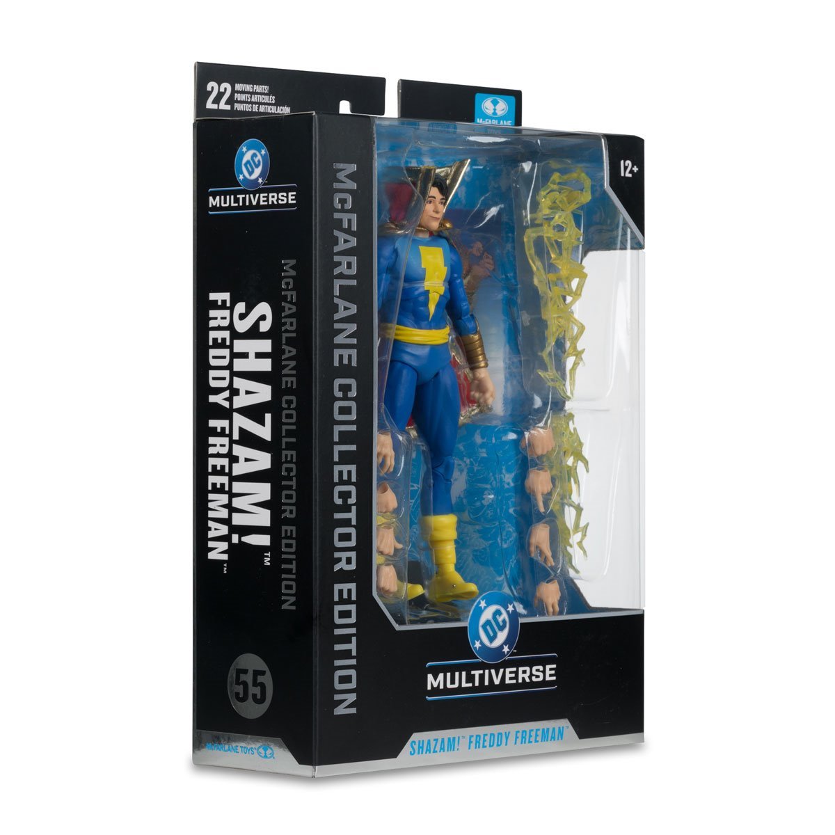Shazam! Freddy Freeman: La representación de Freddy tras la Crisis Infinita llega lista para la acción mágica, incluyendo 8 manos intercambiables y 4 efectos de relámpagos para rodear la figura.