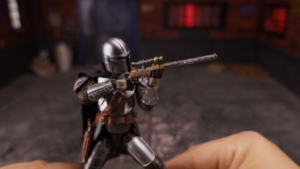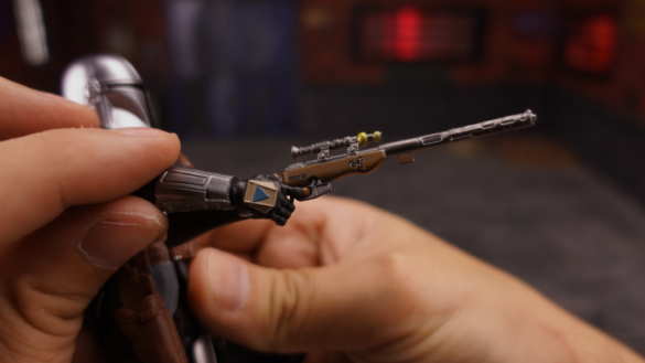 • Funcionalidad: Prácticamente no tiene movilidad, funcionando más como una «figura accesorio». Su diseño está optimizado para que el Mandaloriano pueda cargarlo en la espalda, logrando esa imagen clásica de la serie.