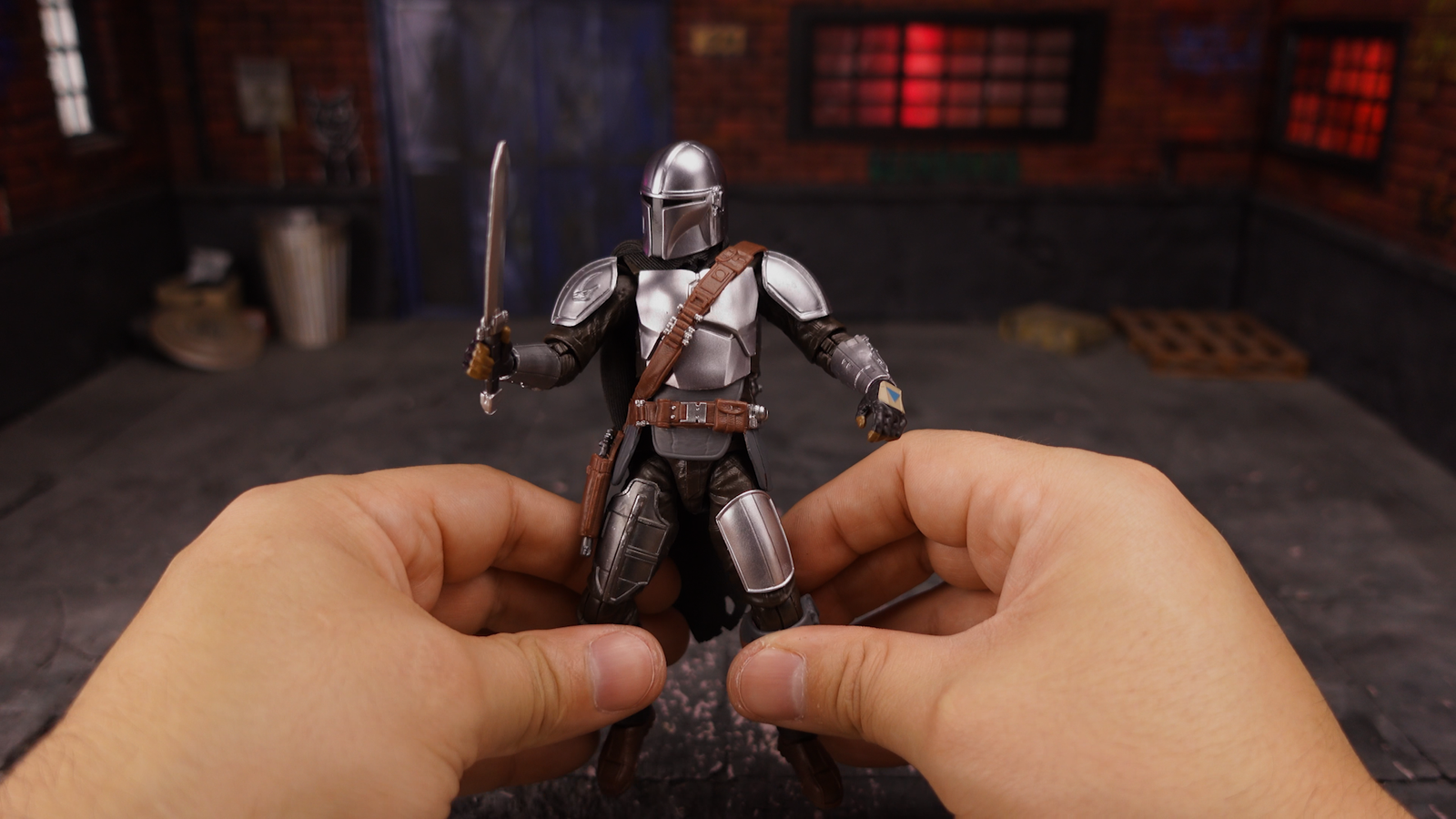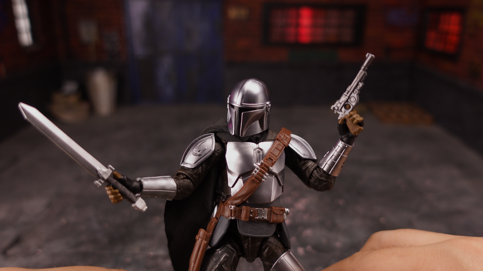 • Armamento Completo: Incluye su rifle de pulsos, la pistola bláster, un vibrocuchillo y la espada oscura (Darksaber).