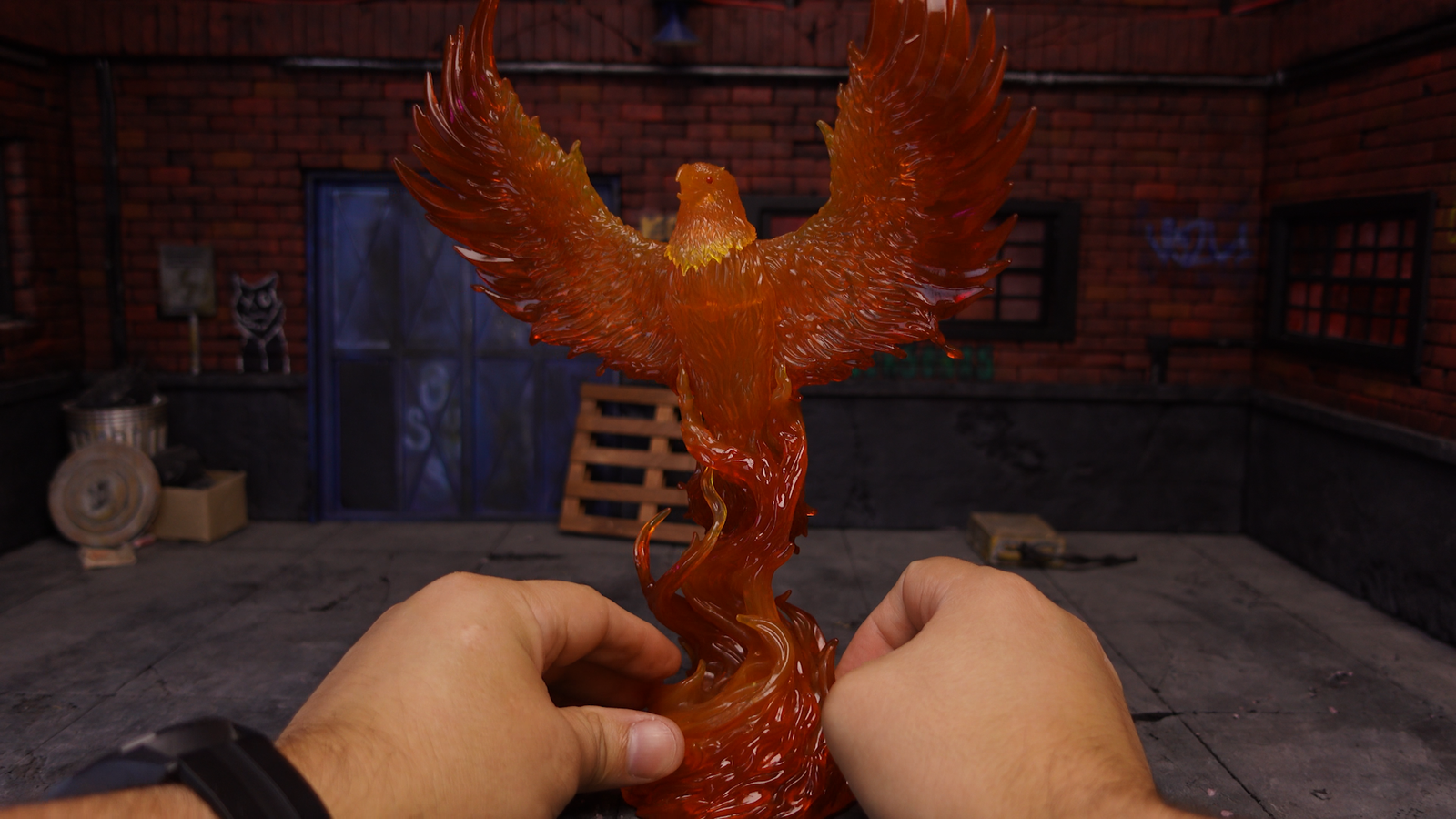 El Gran Atractivo: La estrella indiscutida es su base de fuego en plástico translúcido. Trae un gran Fénix detrás que sirve como stand para la figura. Al posarla ahí, el impacto visual es simplemente impresionante y domina cualquier repisa.
